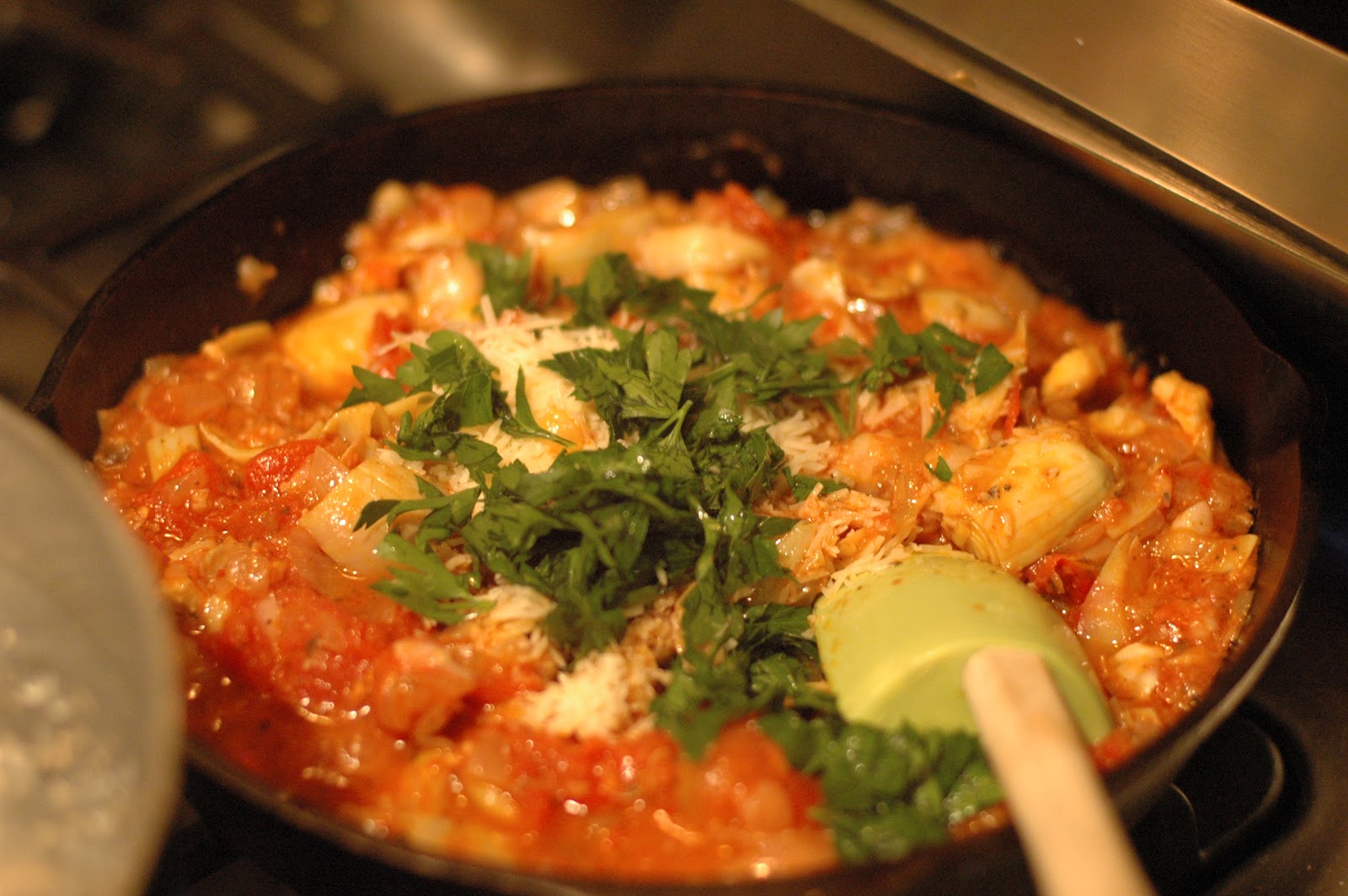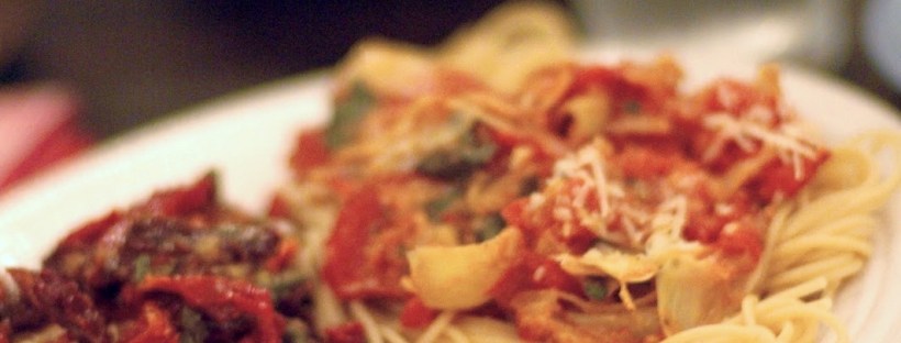 We chose to serve Pasta Raphael with the Chicken, which is a delicious tomato, onion, artichoke pasta sauce recipe from The New Basics Cookbook. Connie was served this dish by our friend Whitney years ago and she introduced me and it’s a favorite of ours. It is a superb sauce. I highly recommend you try it sometime. It’s more work than a simple red sauce, but it is a beautiful and flavorful dish.