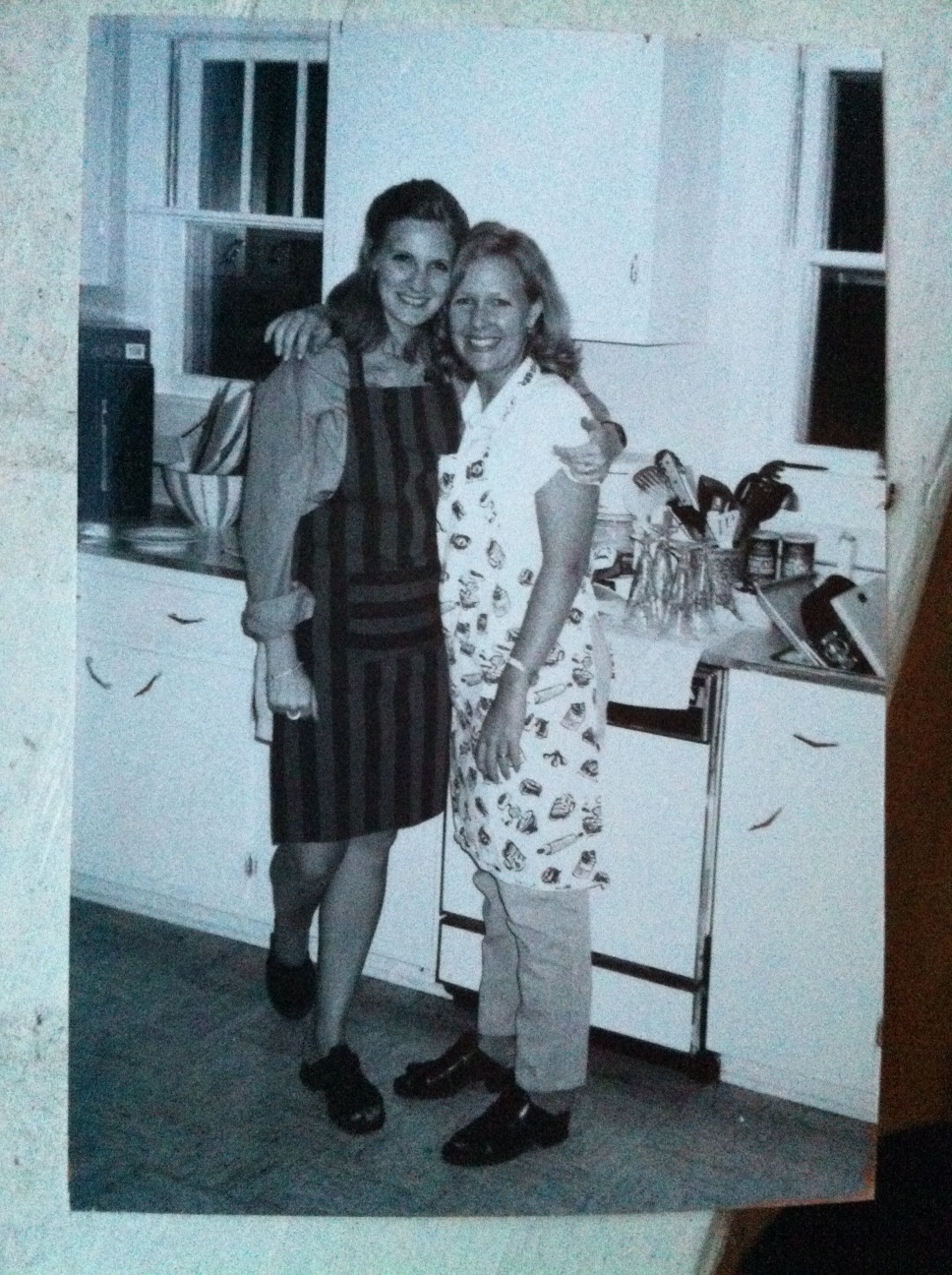 | connie and me a decade ago aproned and cooking for the Celebration of Daves |