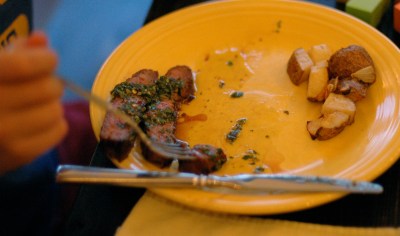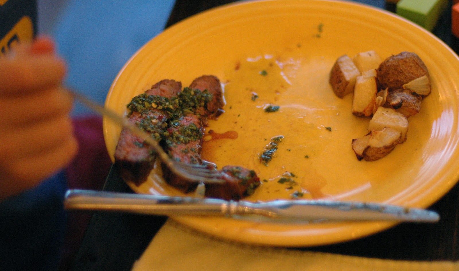 Have you experienced Chimichurri? It’s an Argentinian Sauce, similar to Pesto, but made with a Parsley base. If you haven’t, you must! It was love at first taste for me. A couple of years ago we went to Eastland Cafe for dinner with friends. In our life, this is considered special-occasion, high-style dining – since eating out in our world usually does not include table cloths, servers, and low lighting.