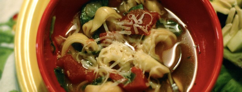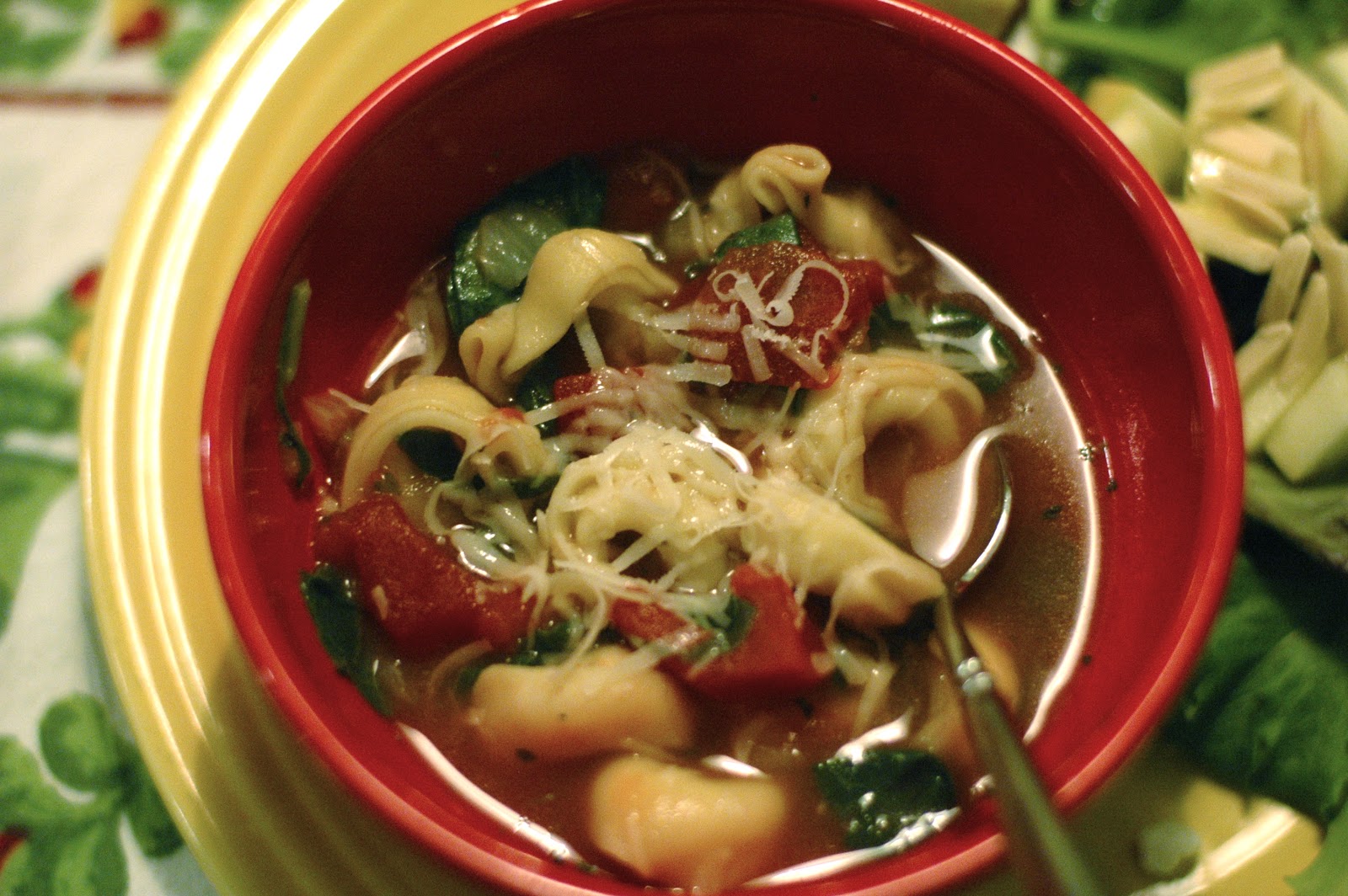 And Soup. I made Tortellini soup, which I had made just the other day for Valentine’s dinner when Lane came to hang out. Though that day, it was actually Tortellini Ravioli Soup. Dave had done the grocery shopping and there was a slight mix up in that he got cheese ravioli from the freezer section instead of cheese tortellini. Thankfully it was mini ravioli and so it could legitimately be eaten as soup because it fit in the spoon. So, we had ravioli in our “tortellini” soup. I told Dave it was apropos for our Valentine meal, as “love bears all things” came to mind from I Corinthians 13.