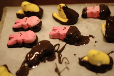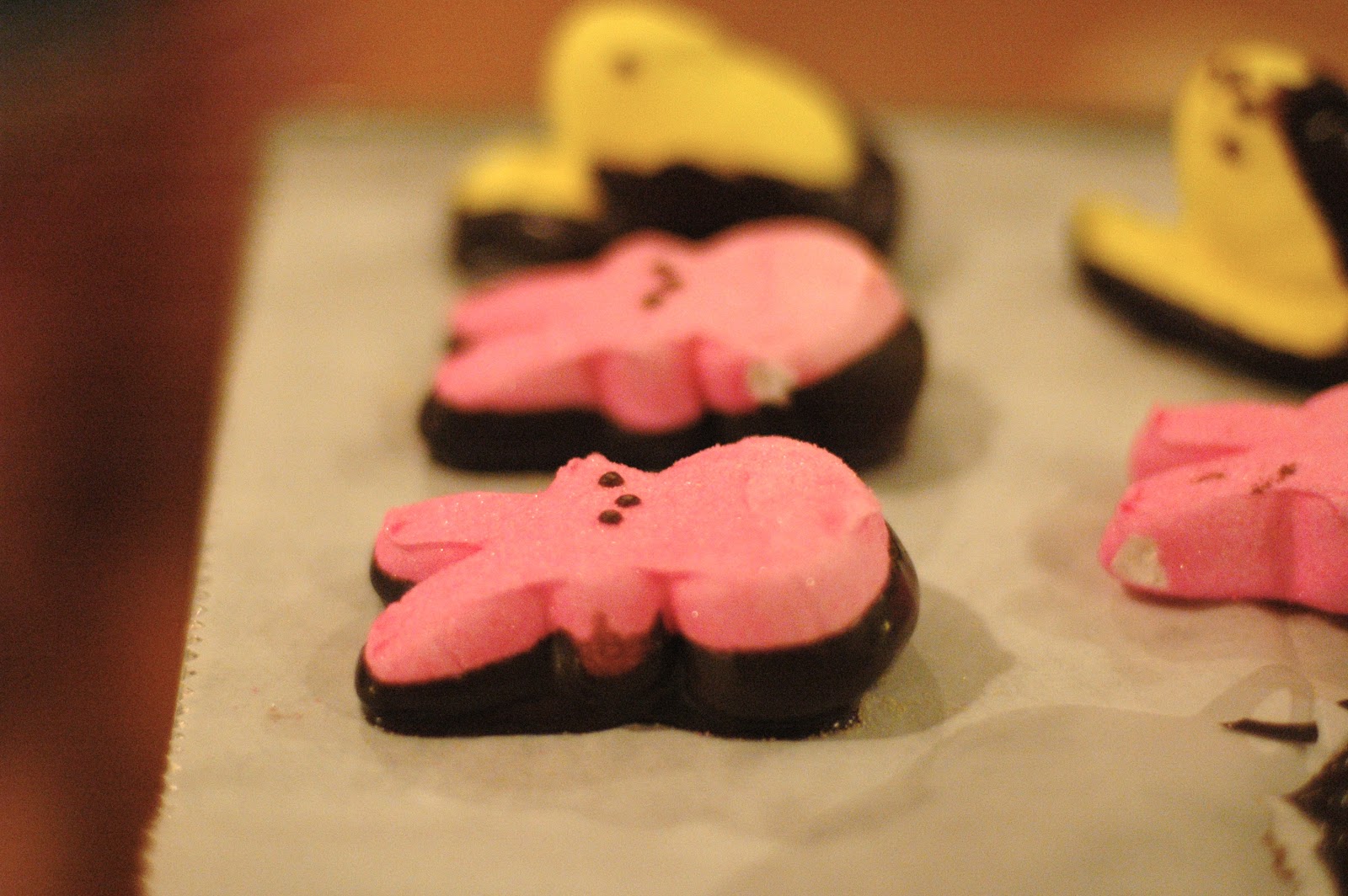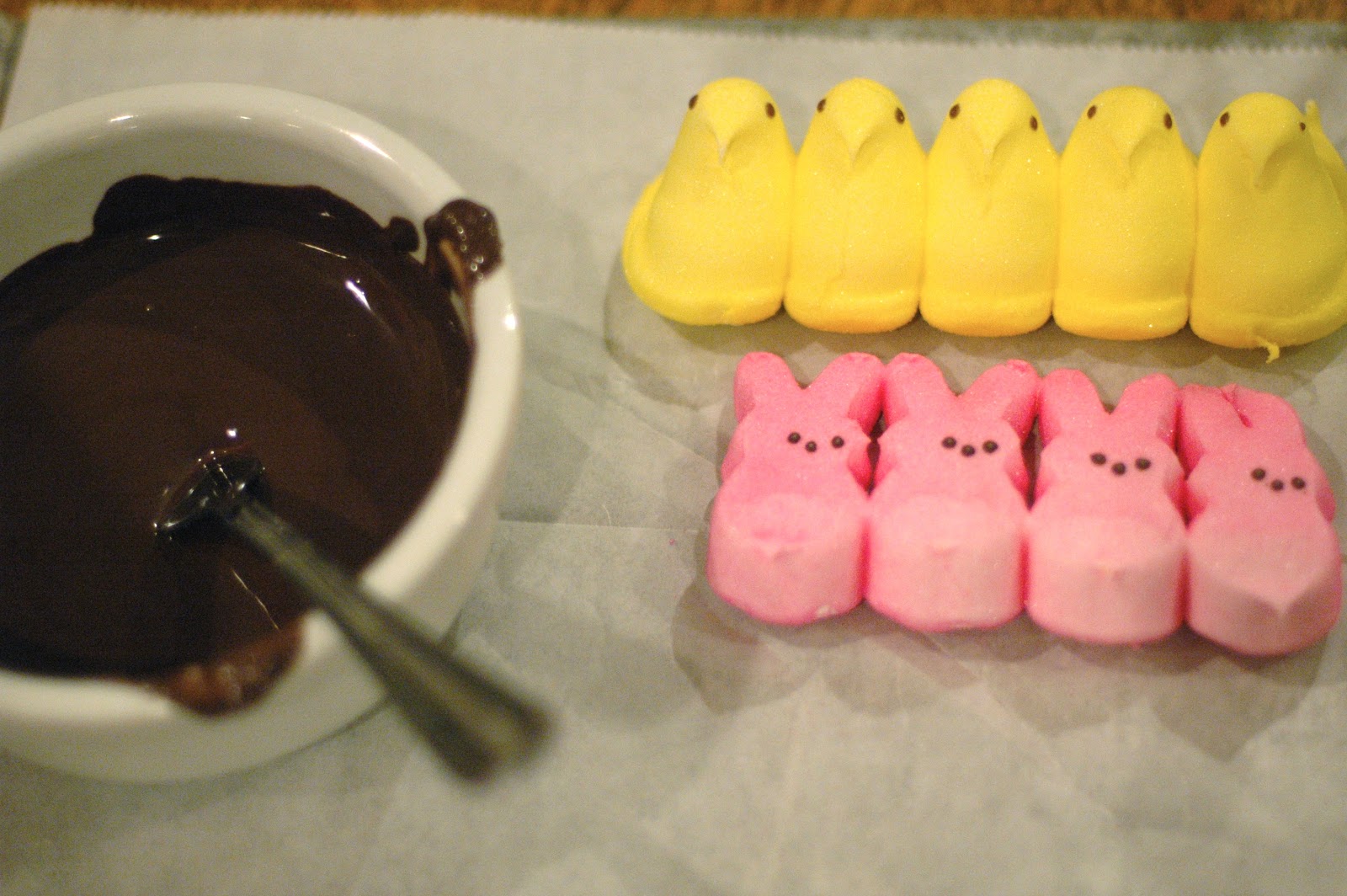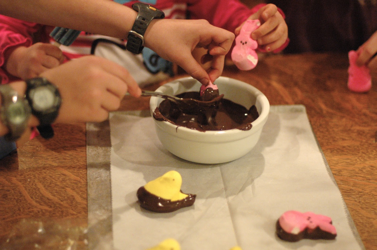 Last year my kids and I dipped some peeps in chocolate.  Even better than peeps, we decided, were chocolate-dipped peeps!