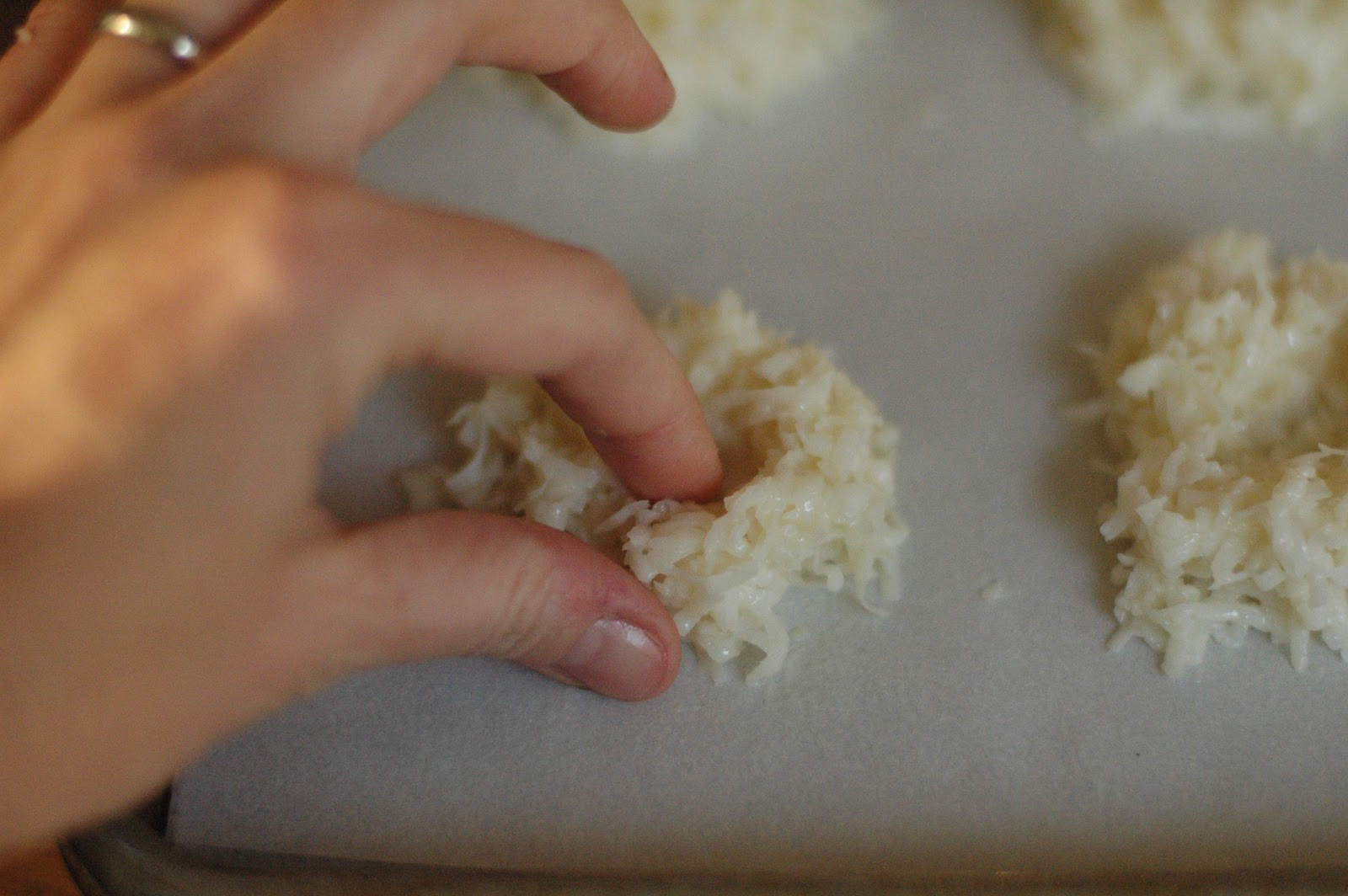 The nest: I tried a couple of different nest recipes, because the first ones I made felt a little goopy and they oozed some condensed milk when cooking – which made them stick to the parchment, ugggh.