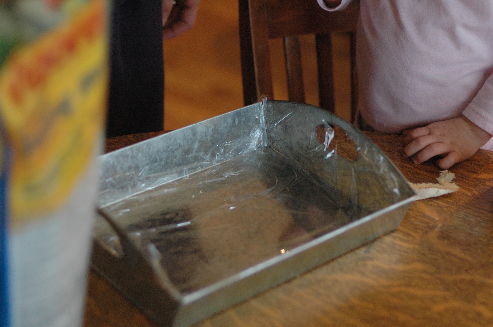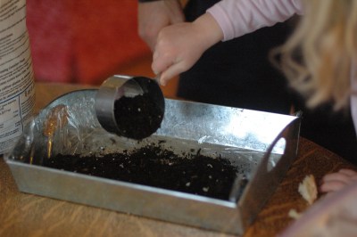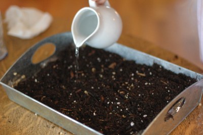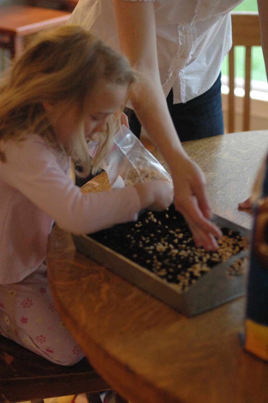 We also did a really fun and SUPRISINGLY successful planting of a patch of Spring grass last week.  My mom told me about doing this and asked if we wanted to try.  She gave us some wheat grass seed that she bought at a health food store.  We soaked them in a bowl of water overnight and then the next day we planted it.  We filled a tray with potting soil.