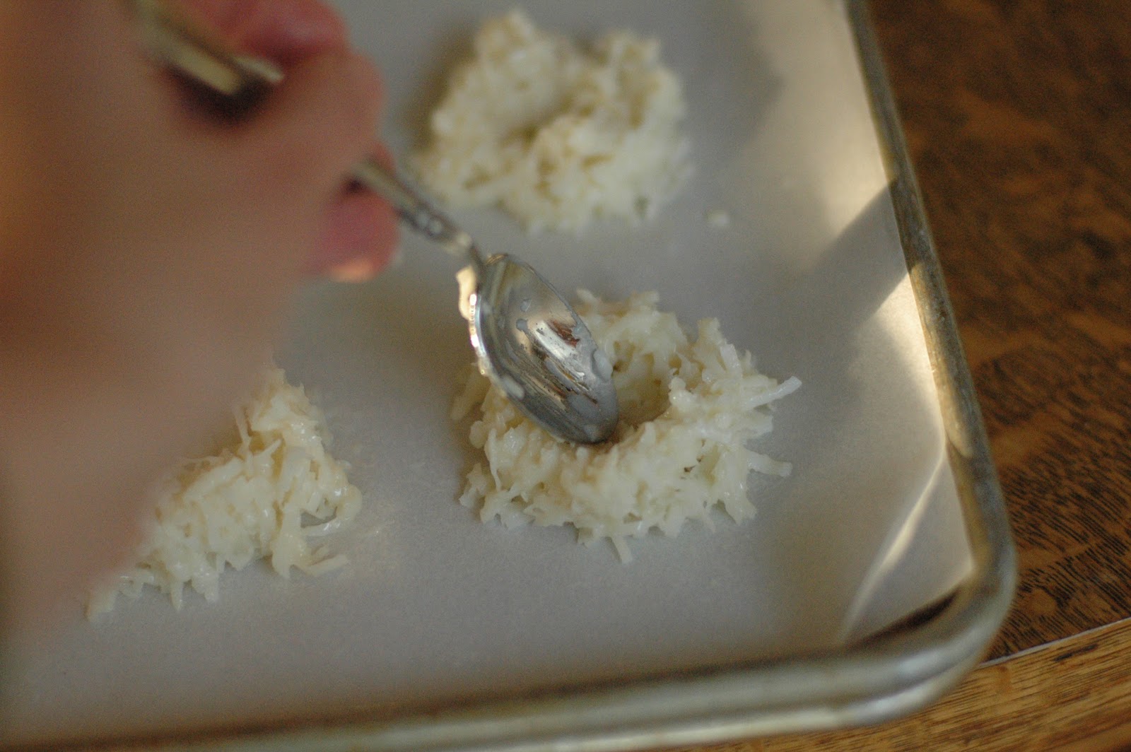 Scoop batter in 2 Tbsp portions on prepared pan.  Form the cookies into the shape of the bird nest.  Make sure your well is deep and the edges are high.  Press down the center with your thumb.