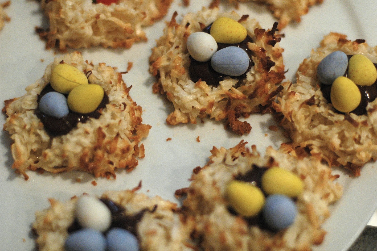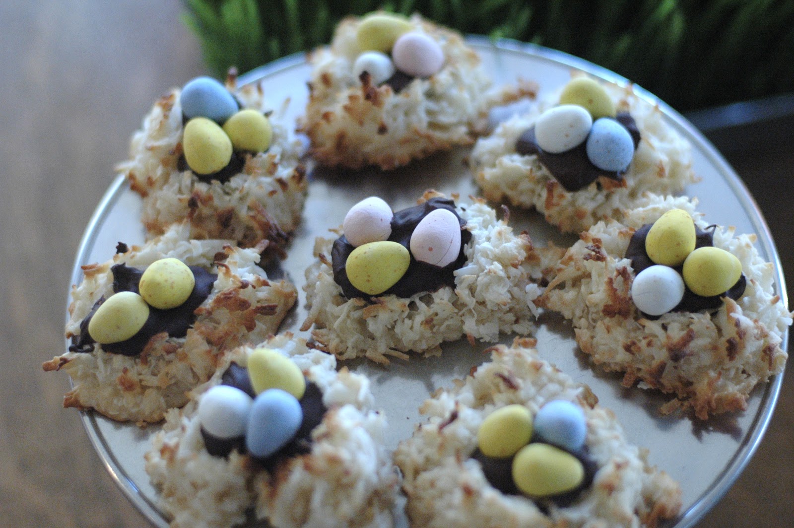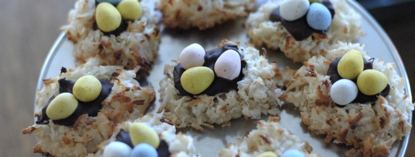 I have been thinking about coconut nests and wishing that I could make some coconut macaroons in nest-shape, holding these Cadbury eggs for Easter.  I tried a few recipes and, after 3 batches and lots of coconut-eating, I think I got what I was hoping for and am ready to share the recipe with you.