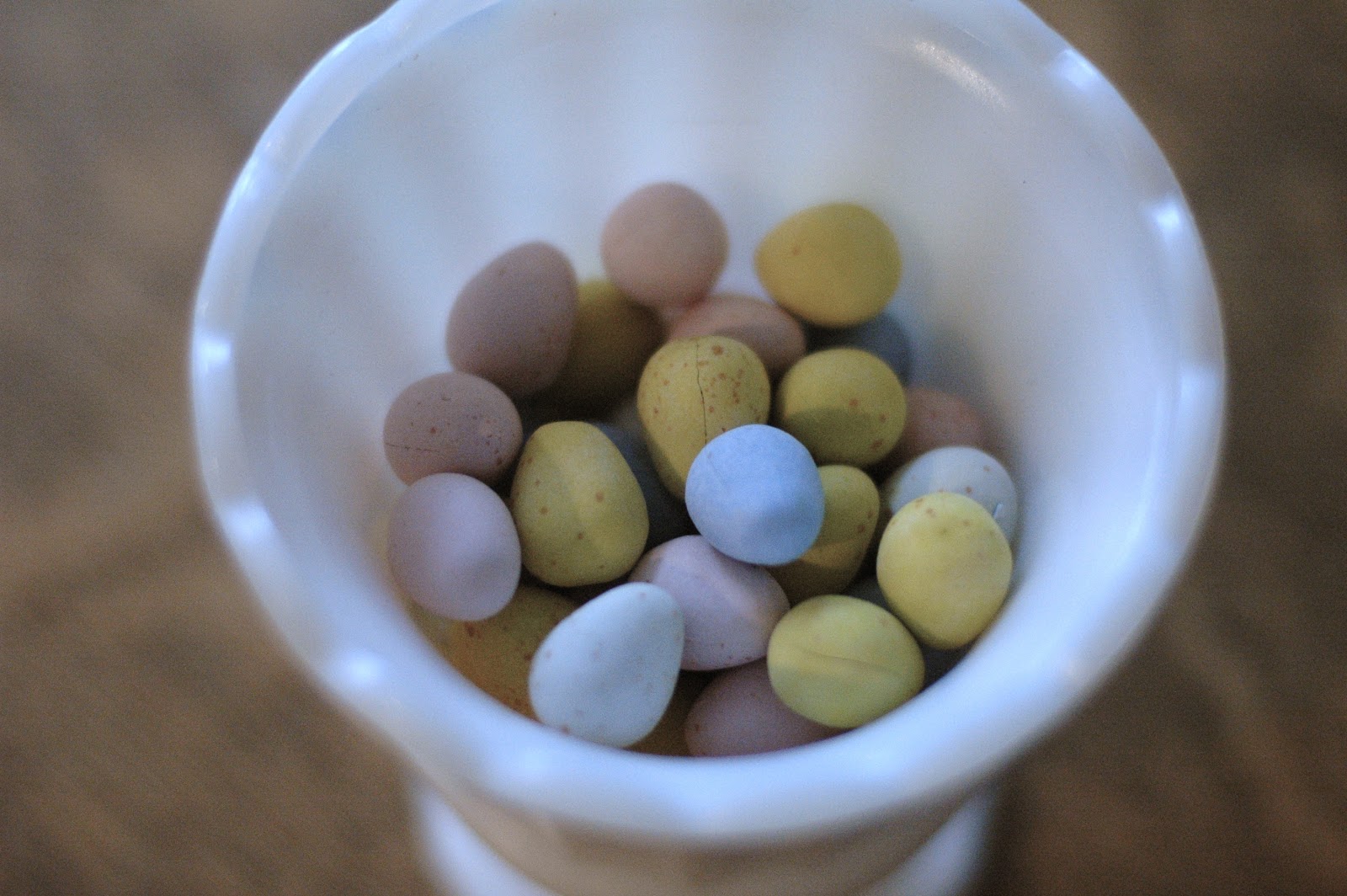 Place a spoonful of the ganache in the nests and place a few candy eggs on top.