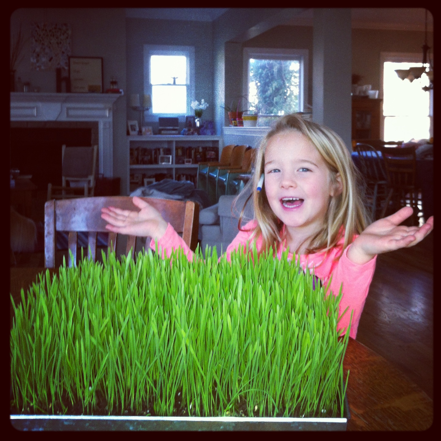 In one week we got a crop of very fun, very green grass! We are going to put some eggs in it once we dye eggs this week for a springy decoration.  (We might have to mow it with some clippers soon).