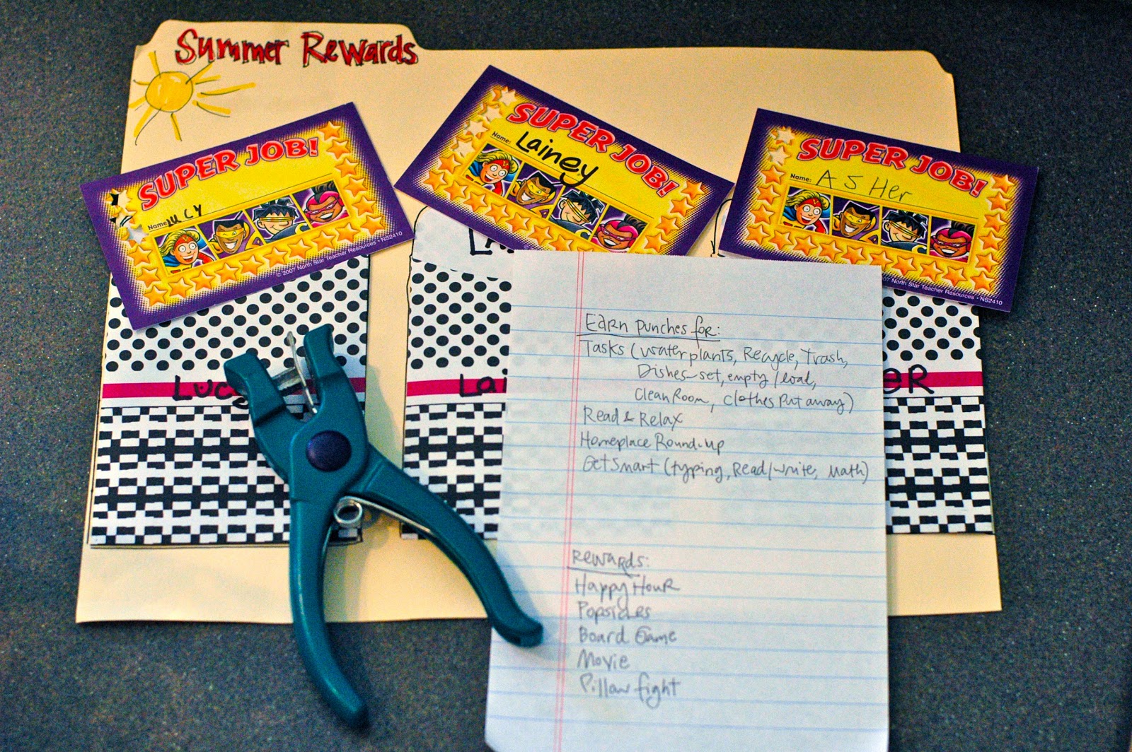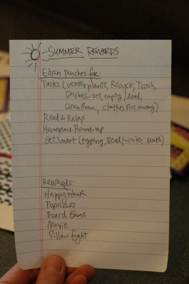 6.  And one last thing. As summer is on our heels, I needed to get a system in place to help manage the pending chaos, positively motivate the troops to do their tasks (chores sounds so dreadful, I like to call them tasks), and do some brainwork this summer.  Lainey has had a system in her class at school this year that has been very effective that we are adopting.  It’s a reward cards system and they get a “punch” with each action that is deemed worthy.  When the card of 20 spots is filled, they can choose a reward. We are calling it Summer Rewards.  I made a list of Punch-Earning Items and Rewards.  We will continue to add to the lists, I’m sure.  I unveiled it to them this weekend and so far they are pretty excited and motivated.