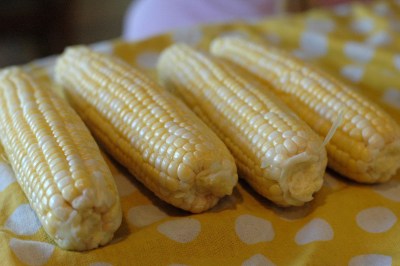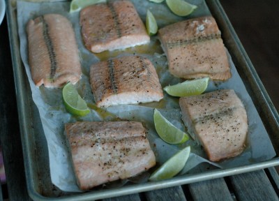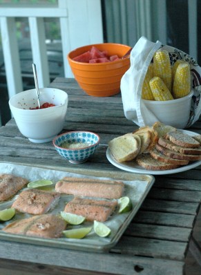 I had on my list of “things to make” the Bruschetta that Pioneer Woman had inspired me to make the other day. (My mom TiVoed the episode and showed it to me and it made my mouth water.) I had seen corn on the cob in the store for a good price and we all love corn on the cob at my house, and watermelons have been delicious the past few weeks. I bought some Salmon, thinking it would make the meal feel special. I made a batch of the Chewy M & M bars, because I was newly in love with them!