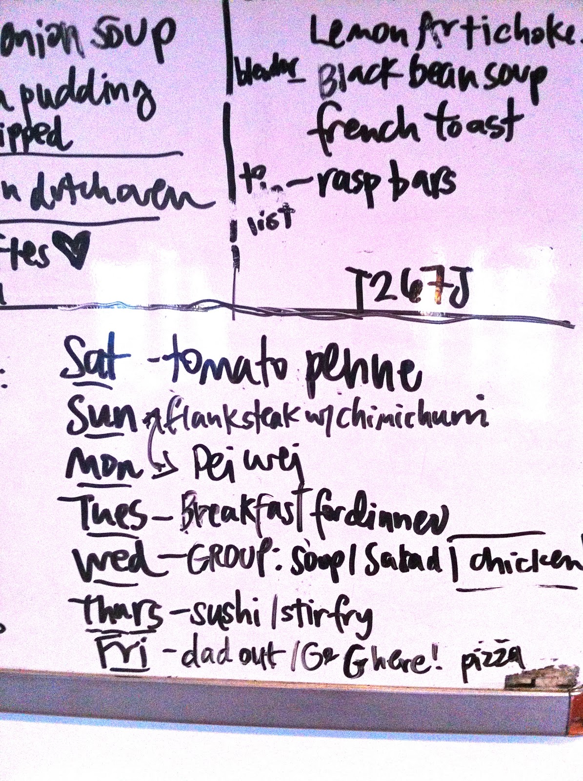 Place that list where you will see it. I put it on the dry erase board that hangs on our fridge and by doing this we are all on the same page – people can know ahead of time what’s for dinner, I don’t feel so lost and there is built-in accountability.