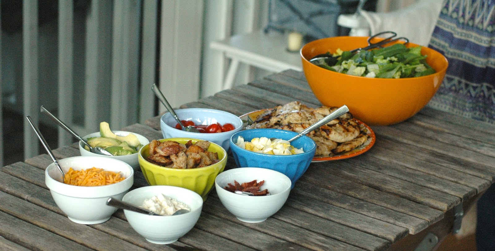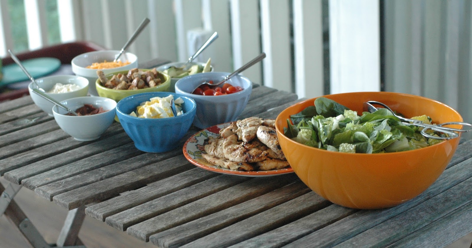 Salad for dinner. It just feels right on a hot summer evening. I like to make a salad bar, where people can put what they want, and how much they want of each item. We started making this “Cobb Salad” a few years ago with our small group from church. We were looking for a semi-healthy meal, but one that was simple, hearty, and kid-friendly all at the same time. This was our solution. We like that if we serve rolls or some kind of good bread with it, then even people who don’t want to have a salad for dinner, can enjoy it (grilled chicken, some boiled eggs, tomato and cucumber slices and a hunk of bread). And for those of us who love a great big dinner salad, we can pile it all on and feast on the beautiful bounty!