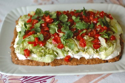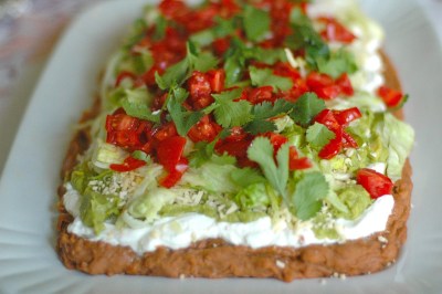 | Spread sour cream on top, leaving an edge to reveal the beans underneath, and then guacamole |