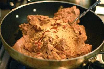 | Warm beans in a skillet on the stove top. Add 2 tsp. ground cumin, ½ tsp. garlic powder and a couple of dashes of hot sauce. |