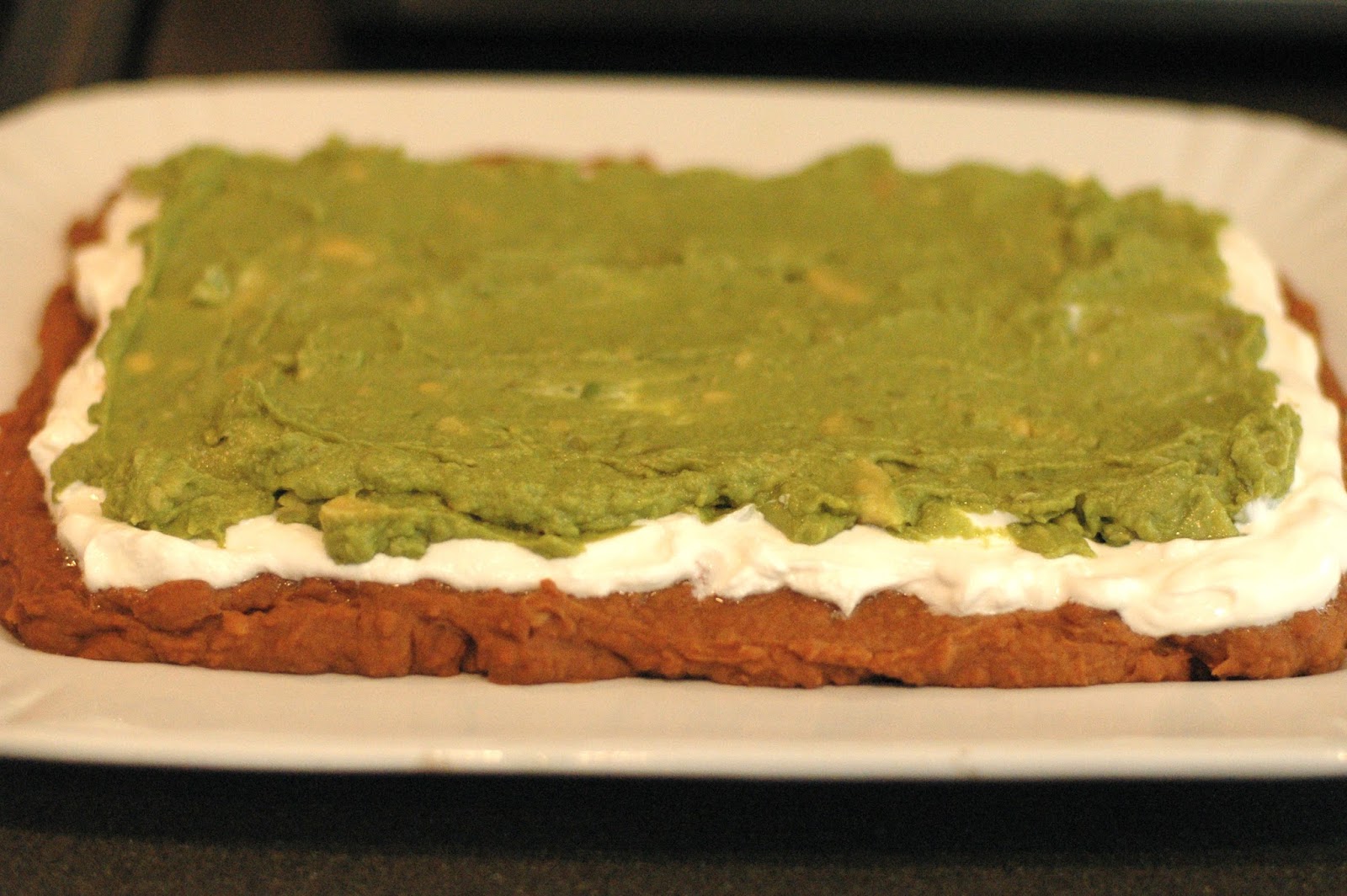 | Spread sour cream on top, leaving an edge to reveal the beans underneath, and then guacamole |
