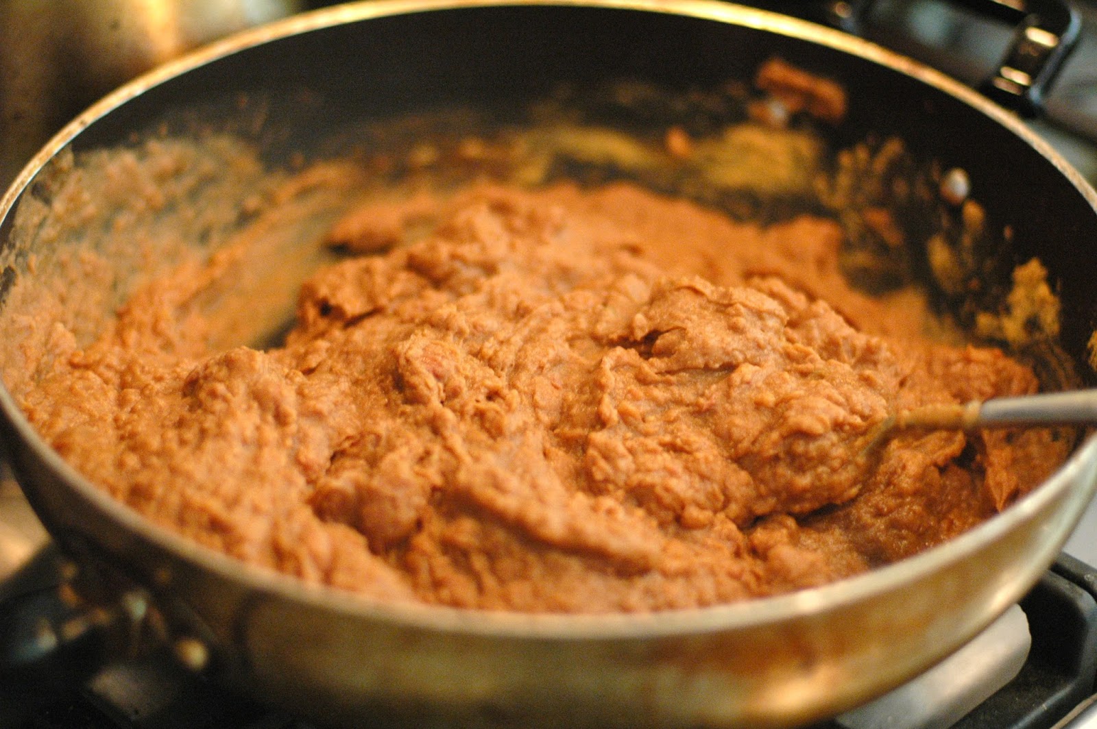 | Warm beans in a skillet on the stove top. Add 2 tsp. ground cumin, ½ tsp. garlic powder and a couple of dashes of hot sauce. |