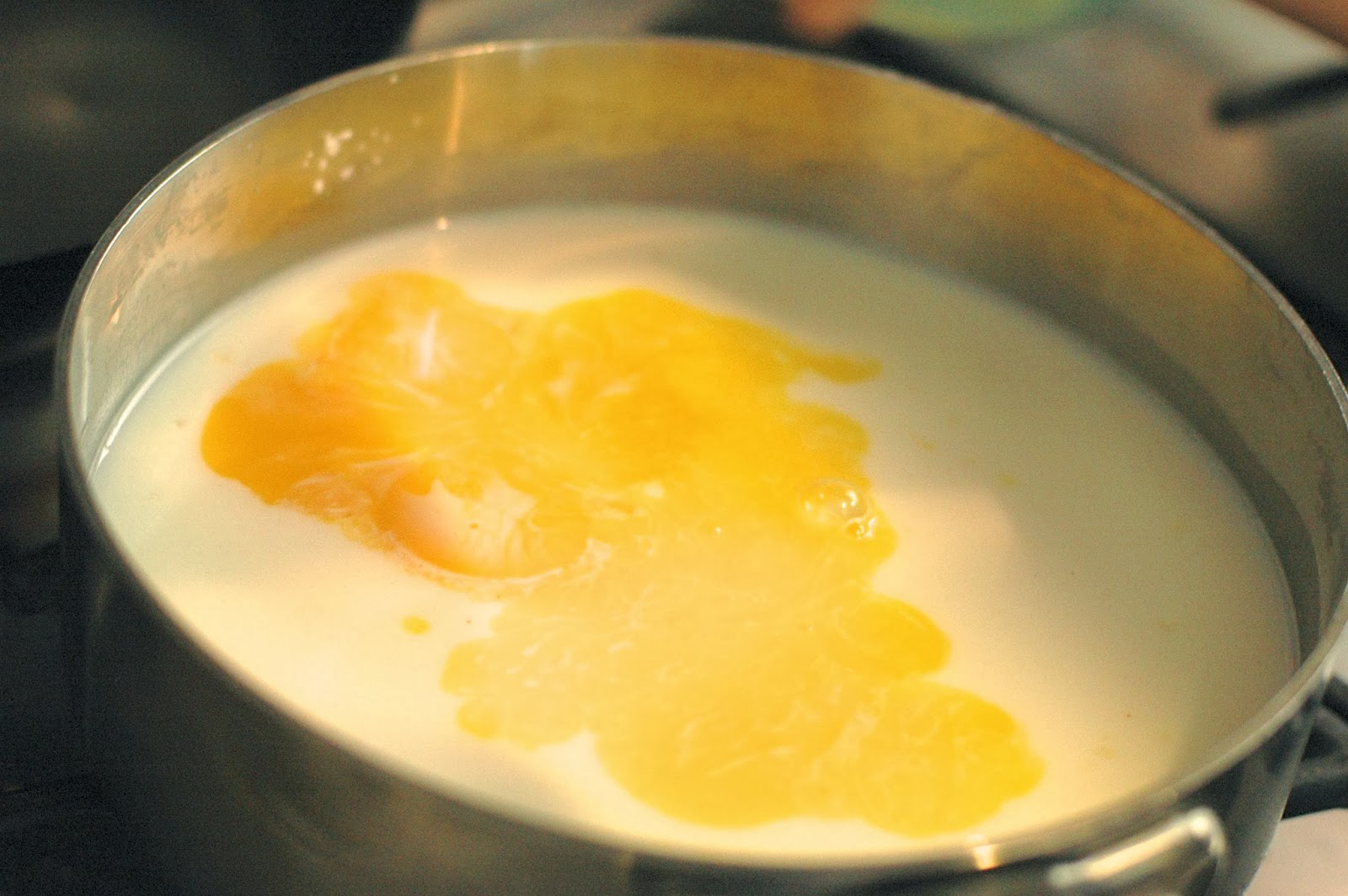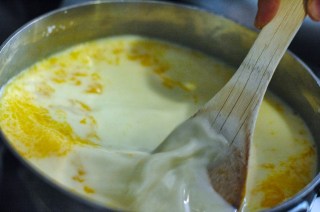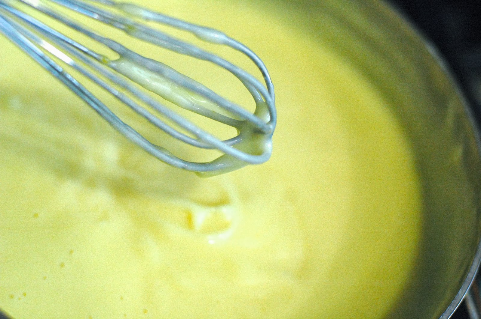 Stirring constantly with a wooden spoon or heatproof rubber spatula, bring the mixture to a bare simmer over medium heat. Remove from the heat, scrape the corners of the saucepan with the spoon or spatula, and whisk until smooth. Return to the heat and, whisking constantly, bring to a simmer and cook for 1 minutes.