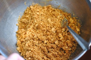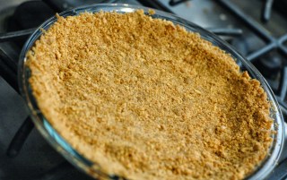Make Graham Cracker Crust – I put graham crackers in a ziplock bag and crush them with my fist, or with a mallet. (You can make them as fine or coarse as you like). Stir together ingredients for the crust. Combine until well incorporated. Press into a lightly greased pie pan – reserving one spoonful for tasting (okay, you don’t have to, but I can’t ever resist!) Place crust into oven and bake for 10 minutes at 350 degrees.