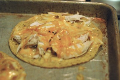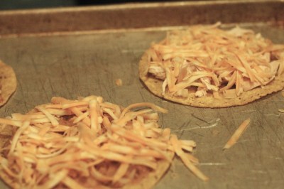 | We make them by putting the meat or beans on a flat taco shell and top with shredded cheese |