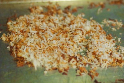 While the ice cream is churning, spread coconut on a baking sheet and bake at 350˚ for a few minutes until toasted and browned on the edges. (You have to watch it because it moves from toasted to over-done very quickly).