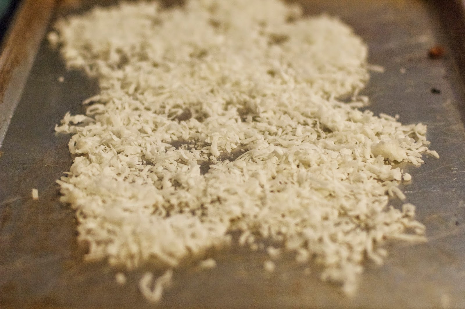 While the ice cream is churning, spread coconut on a baking sheet and bake at 350˚ for a few minutes until toasted and browned on the edges. (You have to watch it because it moves from toasted to over-done very quickly).