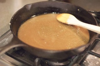 Place butter and brown sugar in skillet on top of stove on medium heat, let melt, swirling with wooden spoon until fully melted. Remove from heat.