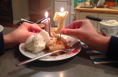 Mom has tried it with apple pie filling instead of fresh apples, and a combination of the two. Using canned is far simpler, as the peeling of the apples is the biggest chore of the pie, but we like the fresh apples better. It’s less mushy. We didn’t make our own crust, but rather used purchased pie crust dough. (I really like the flavor of the Trader Joe’s or if you don’t have that, you can use the Pillsbury crusts found in the refrigerated section in the red box).