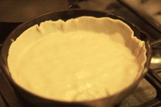 Carefully drape one of the pie crusts into the skillet filled with brown sugar/butter sauce. (I know this seems counterintuitive to place this over the goo, but it is correct).