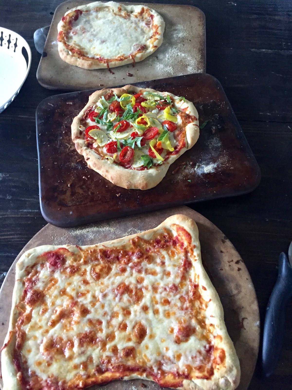 [My friend Karin sent me this video from her kitchen in Vermont, of her technique for stretching out the dough that was so helpful. It’s always been my frustration in pizza making. I asked her if I could attach it to the post for all to see. She obliged.]