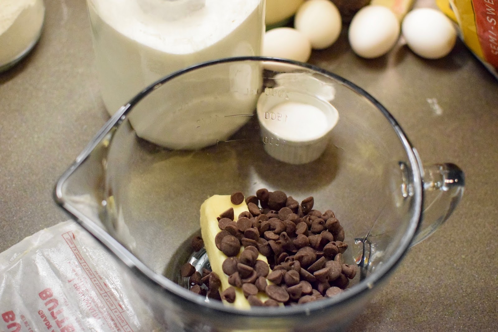 Preheat oven to 350 ˚. Melt the chocolate and butter in a glass bowl in microwave, stirring occasionally until blended. Remove from oven and set aside.
