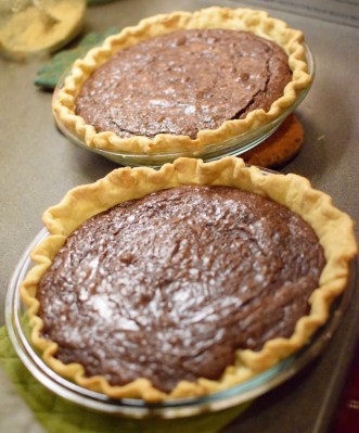 About the time my crusts were thawed on Sunday evening. (I used bought crust that I had in the freezer), I got a group text from my sister letting my mom and me know that she had just made 2 gooey fudge pies for Ben’s math class for Pi Day, wondering how we would be celebrating Pi Day. It must run in the family!