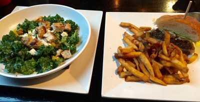 We went to Urban Stack, a local, cool, burger place our friends the Joneses recommended. We of course wanted to get a burger and fries, but this Sunshine Kale Salad on the menu looked really good. Dave suggested we split both…which is my favorite.  We got an incredible burger (with bacon, gruyère/ bleu cheese, and an onion compote) and fries.