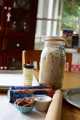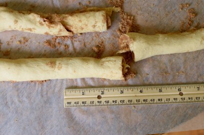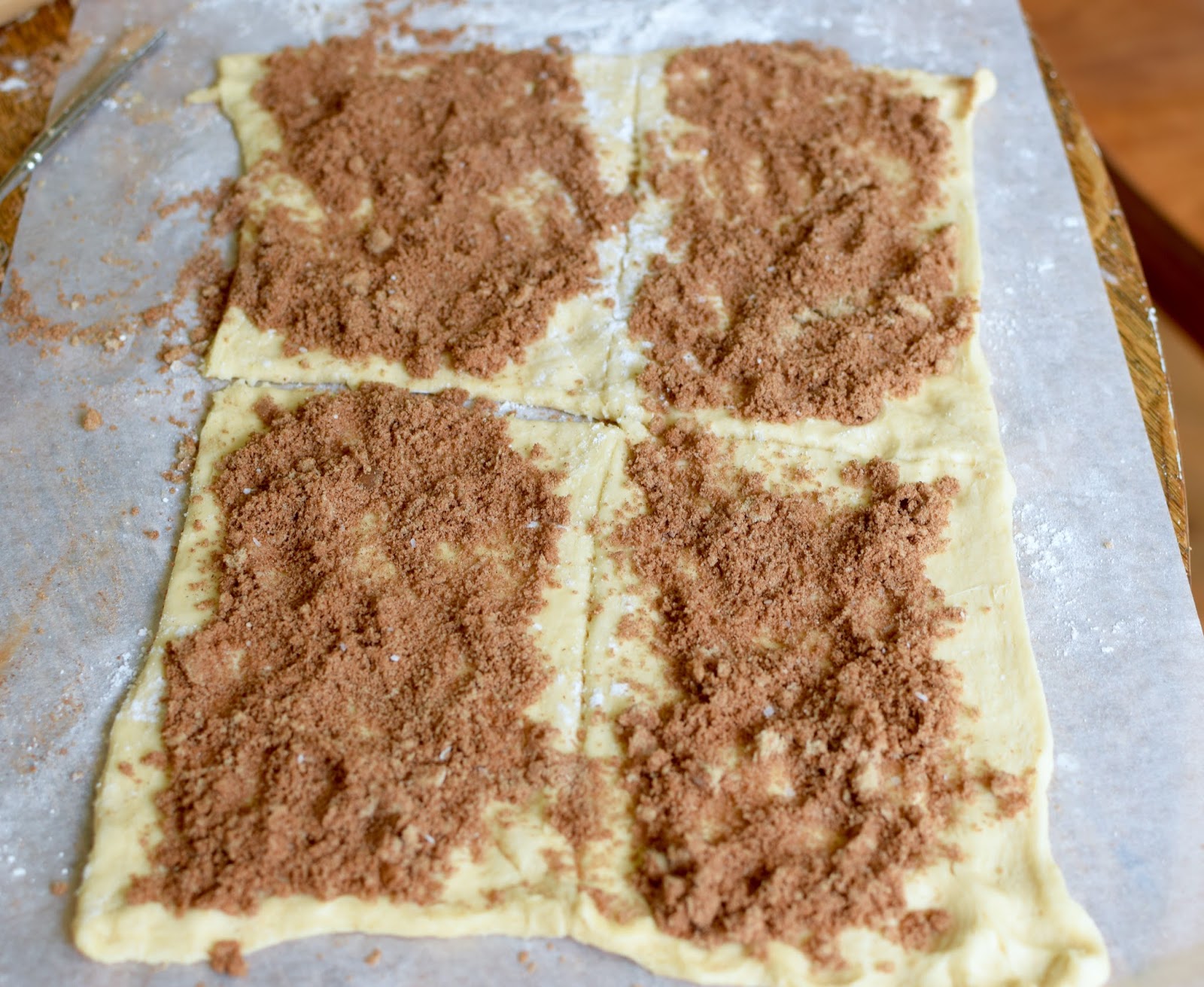 Sprinkle mixture evenly over rectangles- leaving a 1/2 inch margin around the edge (so that the dough can stick to itself when you roll it).