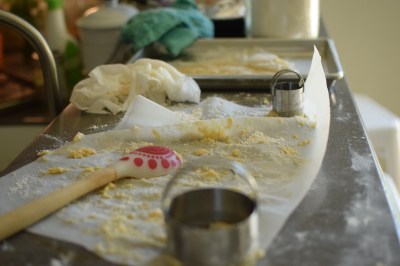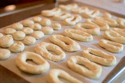 Using a small circle cutter, cut out the middle of the biscuit (or a good cap to a bottle that has a nice clean edge). Depending on the diameter of your biscuit and the size of your circle cutter, you might need to pat out the biscuit dough a little bit with your hand. Set these aside, near the stove top.