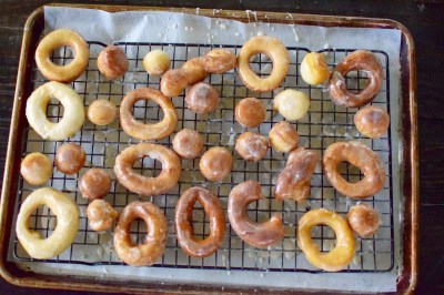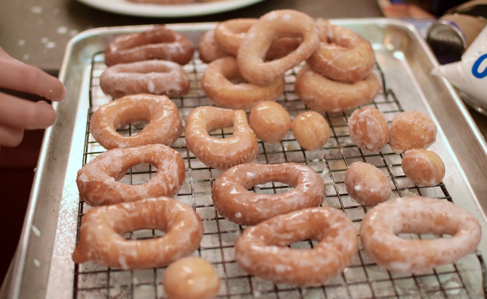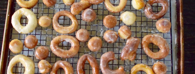 Have another person be the “glazer”, where they dredge the donut through the glaze and flip to coat. After tapping off excess glaze, place on a drying rack on top of a baking sheet (lined with parchment paper for easy clean up).
