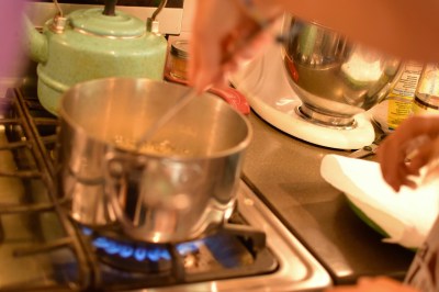 In a medium sized pot, scoop in enough coconut oil to make a 3 inch (or so) deep bath. Heat on medium high burner until simmering. (Don’t let it get to a rolling boil.)