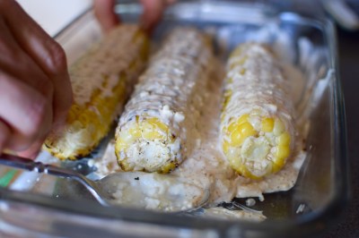 Shuck 4 cobs of corn and wash thoroughly, removing the silks as much as you can.