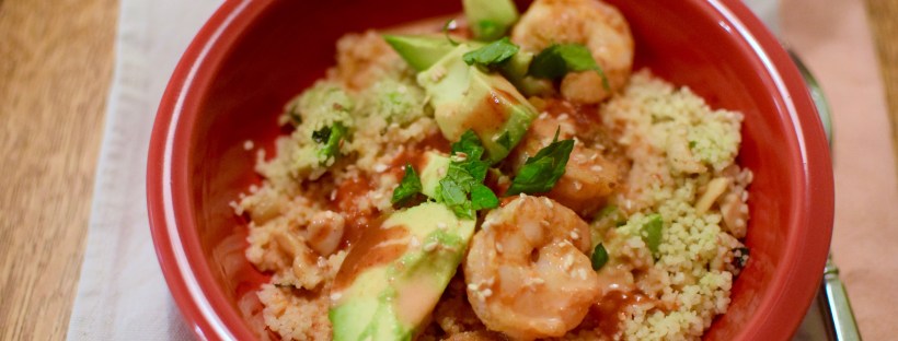 4. To serve, divide couscous mixture onto serving plates and arrange the shrimp around or on top of each plate. Garnish with remaining coconut curry, sesame seeds, cashews, and a drizzle of sriracha for spice.
