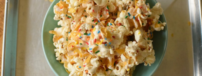 It’s like a popcorn/Rice Krispie Treat Mashup. It’s a little messy to eat, but no one seems to mind the sticky fingers. It’s salty/sweet and snack/dessert. The cornflakes add a good crunch and the sprinkles make it extra fun!