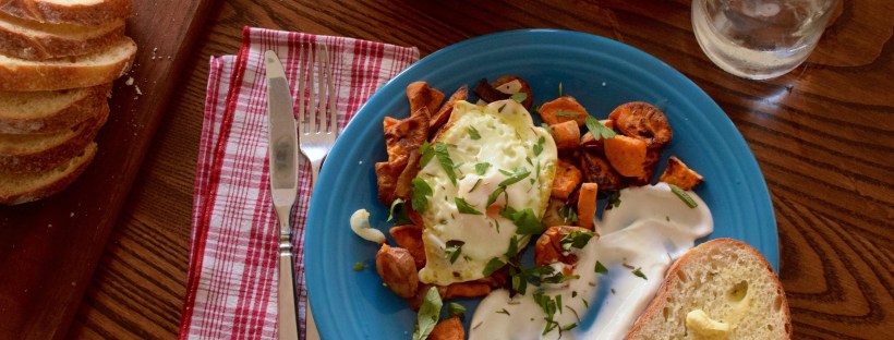 Here is the post I wrote about Eggs and Hash. I have been roasting potatoes, sweet potatoes, and onions in the oven and topping with an egg. This new egg technique has made our process simpler as we can fry 5-6 eggs at a time with 2 pans on the stovetop, and with no flipping required, you can squeeze more in the pan.