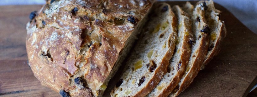 A rustic, chewy loaf of artisan-style bread, chock-full of plump raisins and cinnamon.