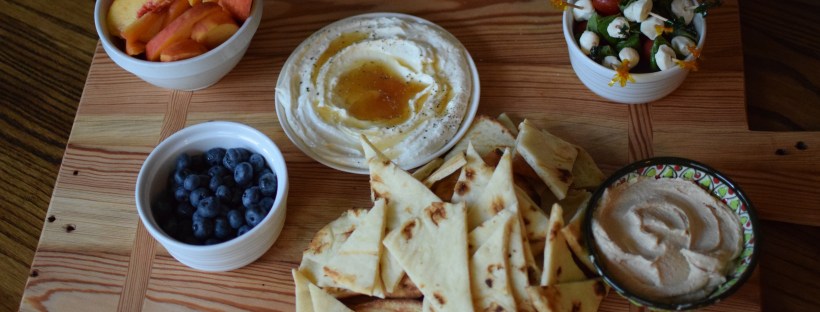 Fast forward a year. We had dinner at a family’s home this summer and as we were planning our menu, Sarah, the host, suggested a toothpick dinner– which she defined as “small items, finger foods, etc.” This sounded super fun and simple. She said I could just let her know what we would bring (family favorites, she said) and she would fill in. I decided that I would bring a version of the memorable sausage, naan, whipped feta tray as our main contribution (and a few of other things- including a jar of bought pickled okra- a recent crave of mine, dried figs sliced from Costco that are like candy , an almond shortcake for dessert and some beverages). We packed it up to travel down the street to their home.