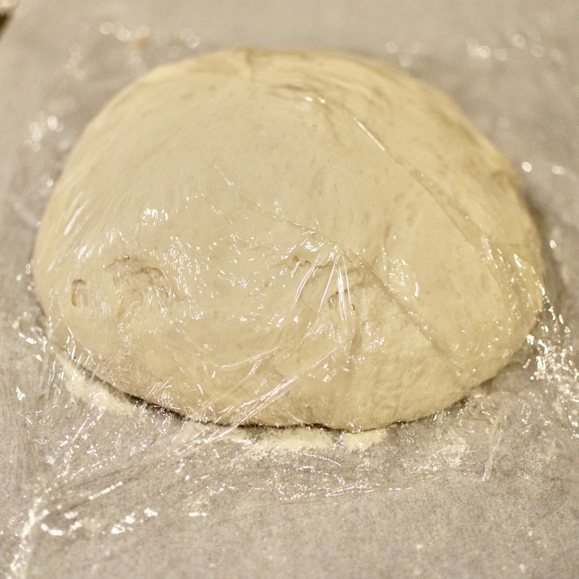 Lightly oil a work surface and place dough on it; (dust with flour if super sticky); fold it over on itself once or twice. Place on a piece of parchment sprinkled with cornmeal. Cover loosely with plastic wrap on top and let rest 30 minutes more.