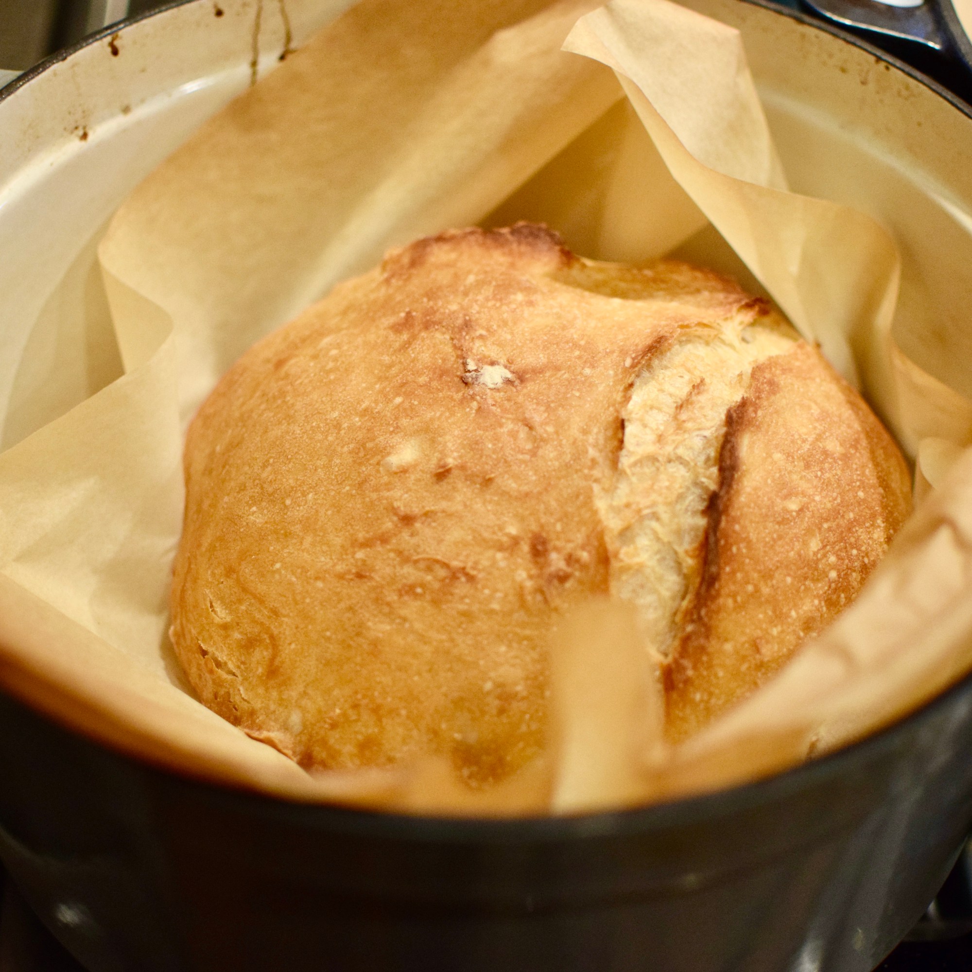 Meanwhile, heat oven to 450 degrees. Put a 6-to-8-quart heavy covered pot (cast iron, enamel, Pyrex or ceramic) in oven as it heats. When dough is ready, (with oven mitt on) remove lid from the pot, carefully lift the parchment into the pot, and return lid on top. Close oven.