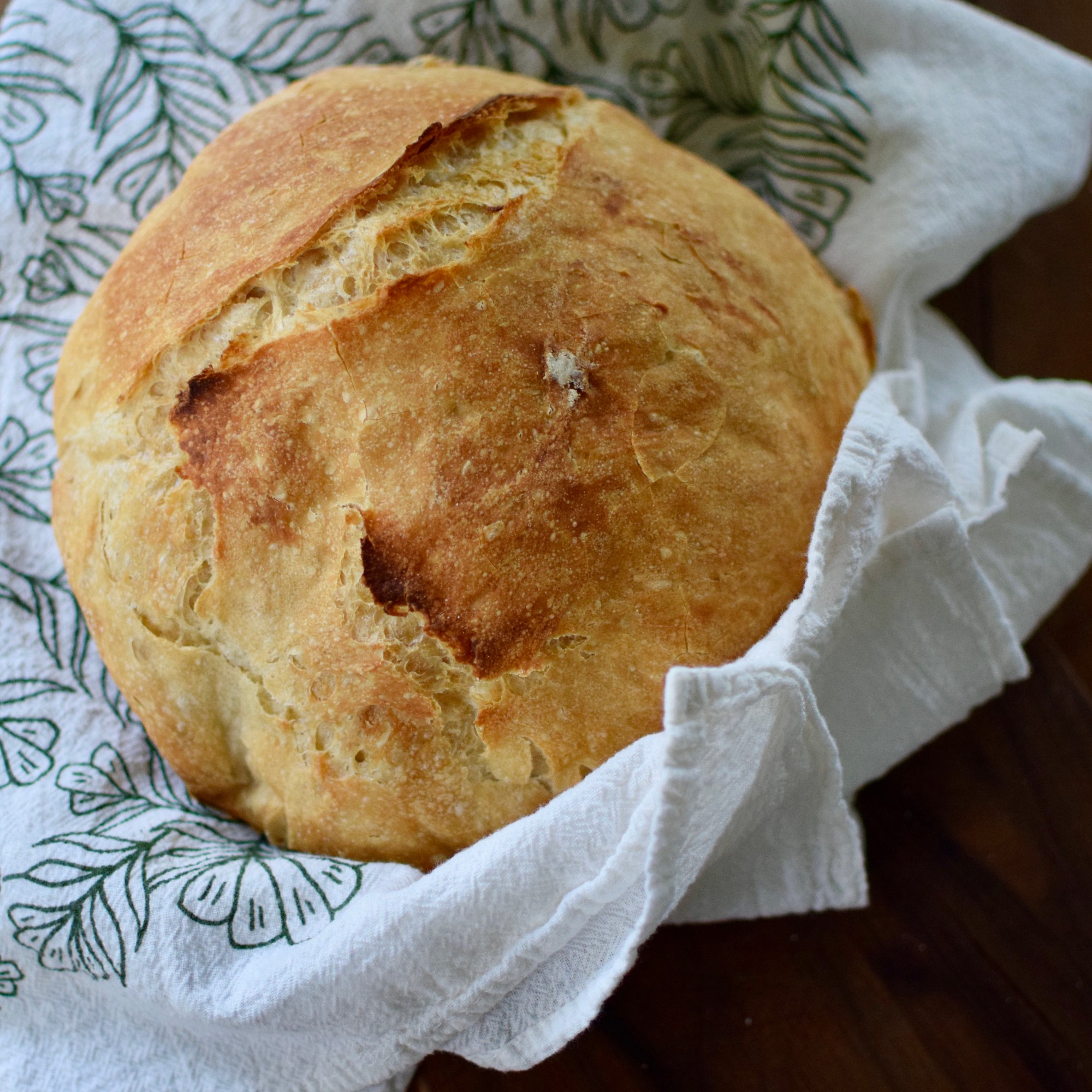 Bake with lid on pot for 30 minutes, then remove lid and bake another 15 to 30 minutes, until loaf is beautifully browned. Cool on a rack. Bread will stay good for a couple of days if in a sealed container or ziplock bag. Freezes well if thoroughly sealed.