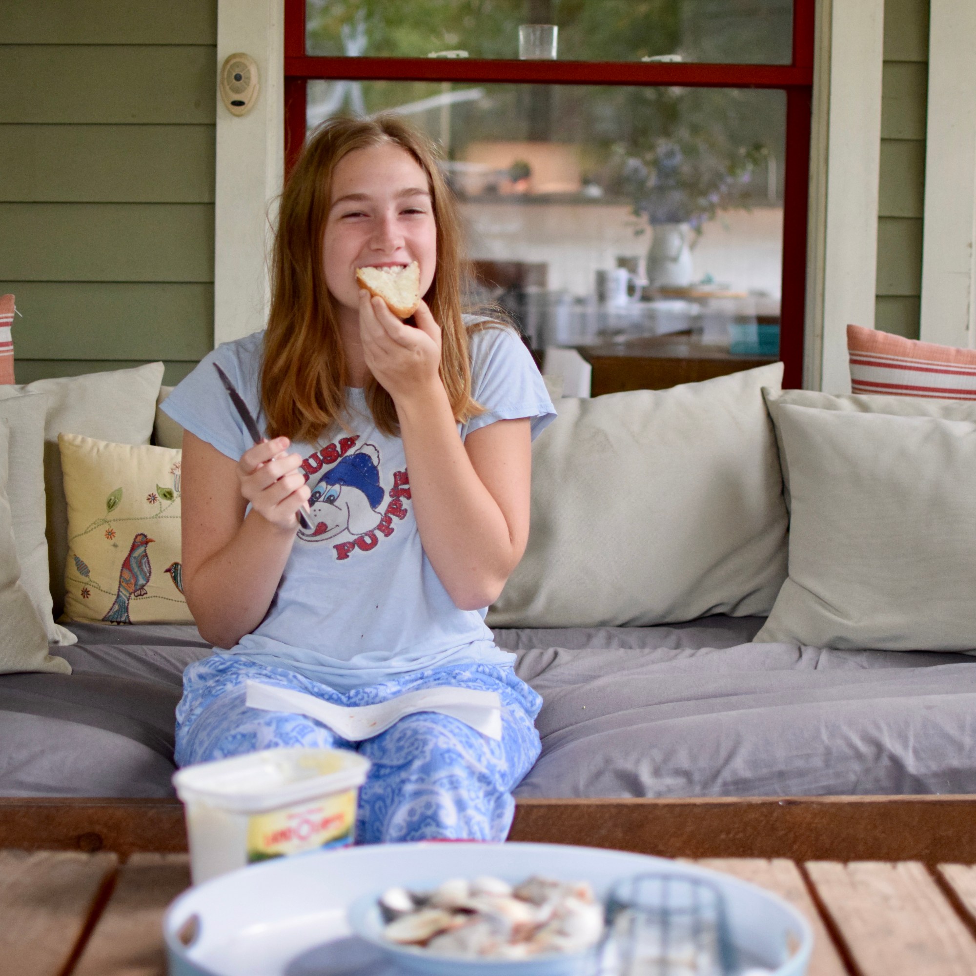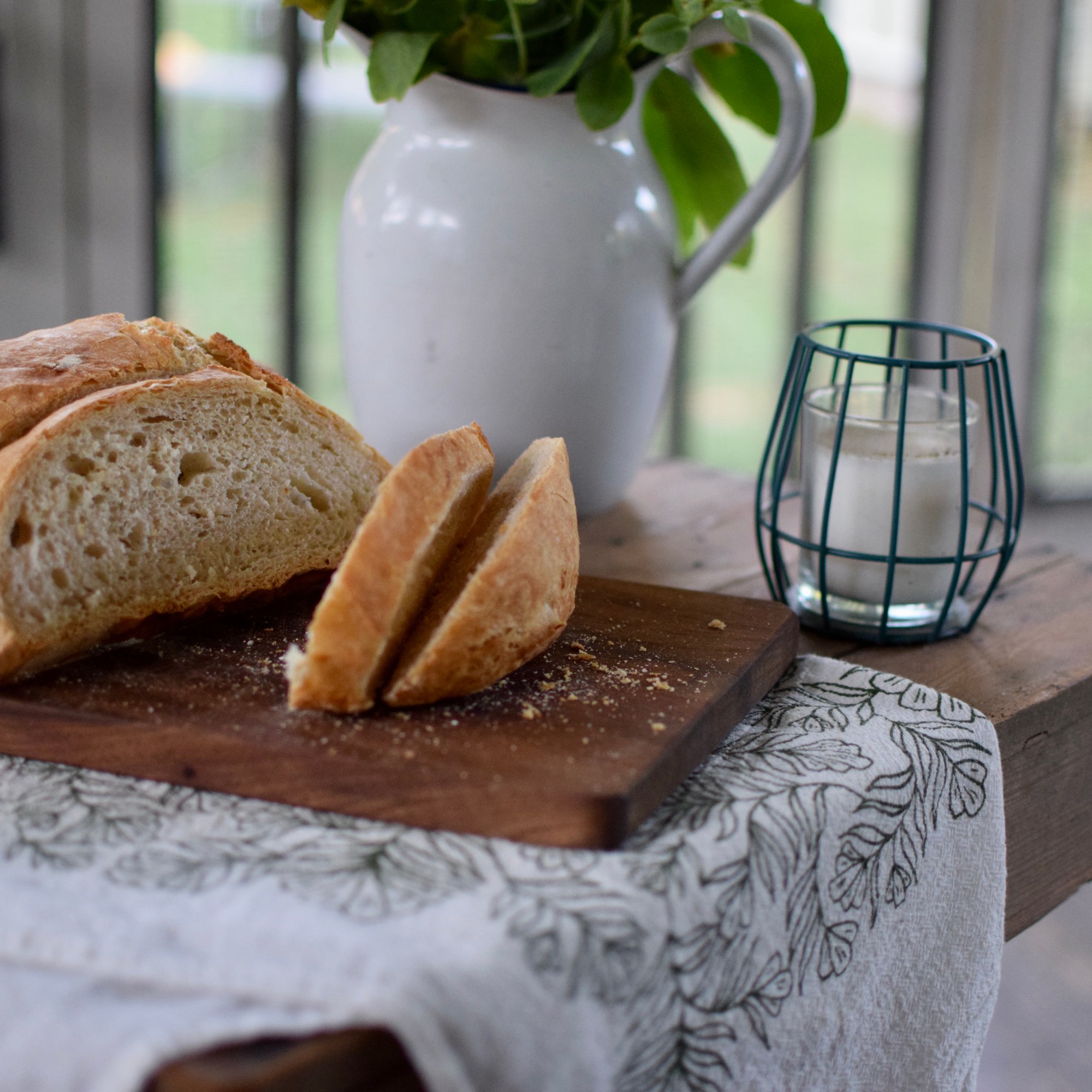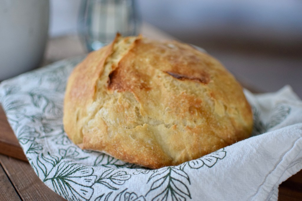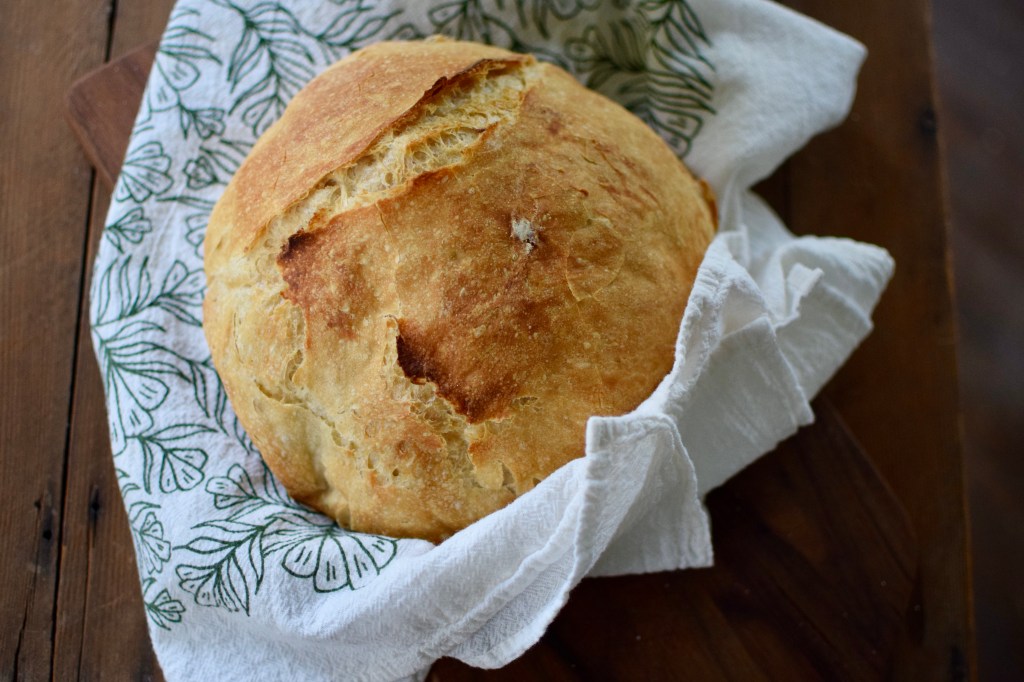 During the pandemic there has been much talk about sourdough bread making (and vegetable gardening, and house projects, and many of the *silver linings* to a stay-at-home order). Though my yard was neglected and my house didn’t get any make overs, I sure have made a lot of bread. Lainey, my older daughter wanted to learn to bake bread. So, we started with the Artisan Bread in 5 Minutes a Day recipe. It’s tasty bread, extremely simple, and the best part is that you make the dough and then have 5 loaves of dough in-waiting in your fridge. You then can peel what you want– rest, rise, and bake.