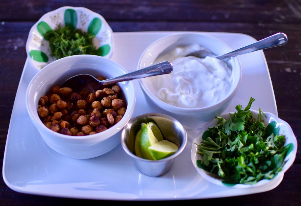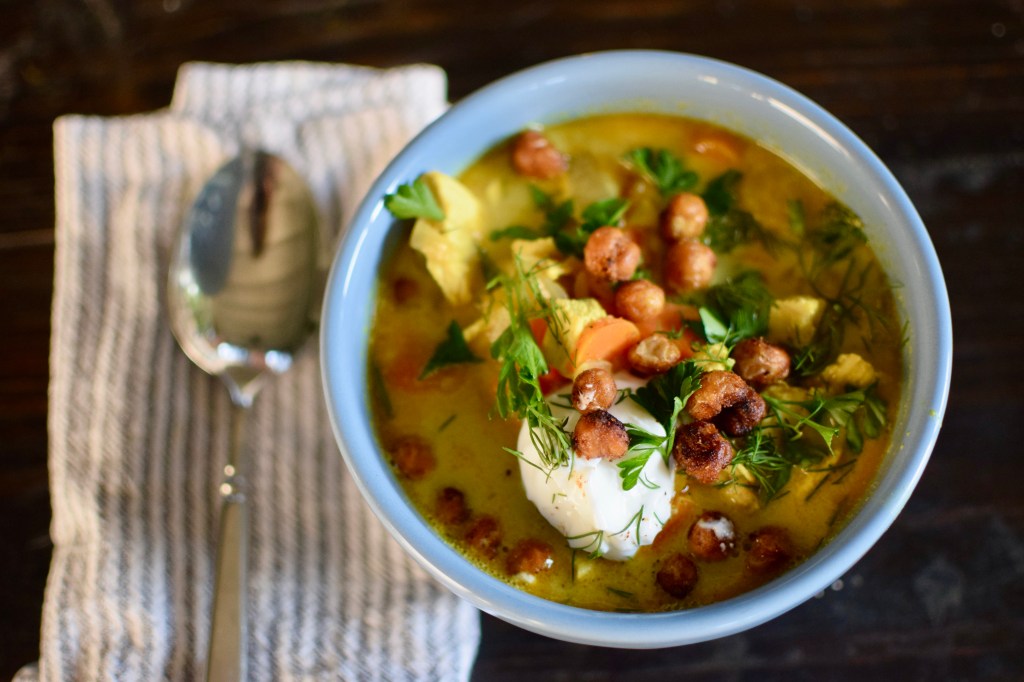 Ladle the soup into bowls and garnish with a dollop of greek yogurt, lots of parsley leaves, fresh dill leaves, sliced green onions, the crispy chickpeas, and a squeeze of lime juice.