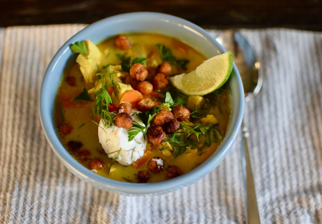 The flavors are so complex and comforting!! It has a hint of Asian with the coconut milk and the harissa, but the fresh dill and parsley, and the roasted chick pea garnish make it so beautiful and unique. We served it with a pot of rice, because my people love a starch, and makes it more filling.