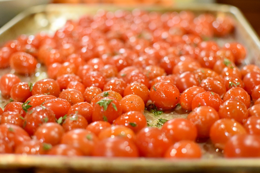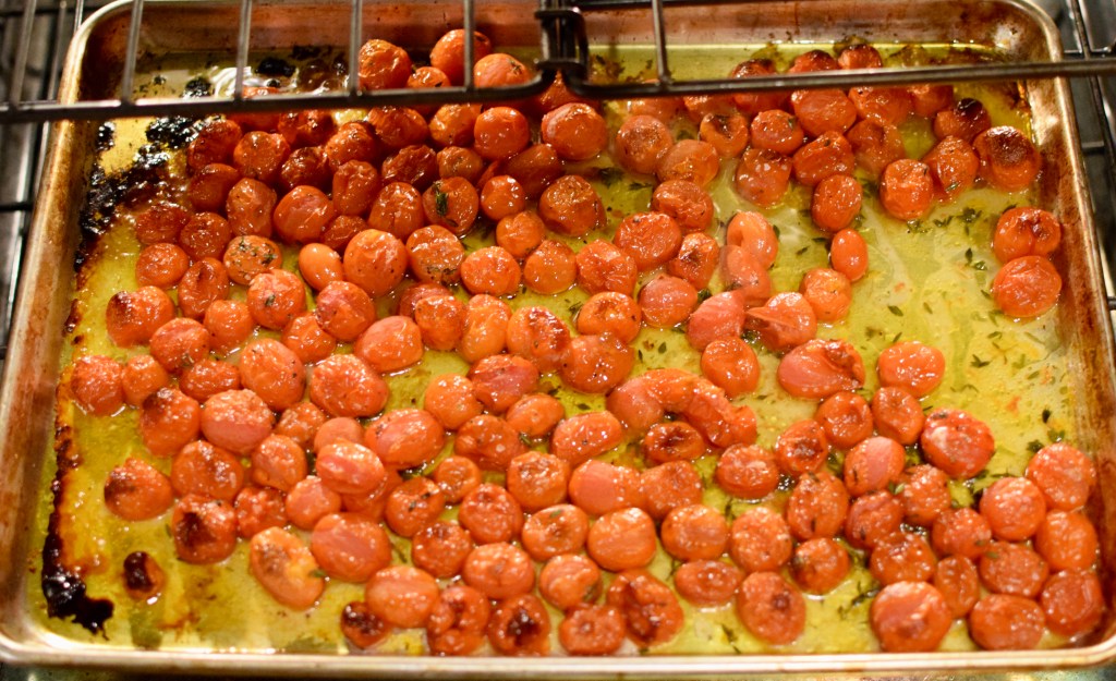 - In a large baking dish or on a sheet pan, toss the tomatoes with 1/4 cup oil and thyme; season well with salt and pepper. Roast tomatoes until they have collapsed and begin to turn golden around the edges, 20 to 25 minutes.