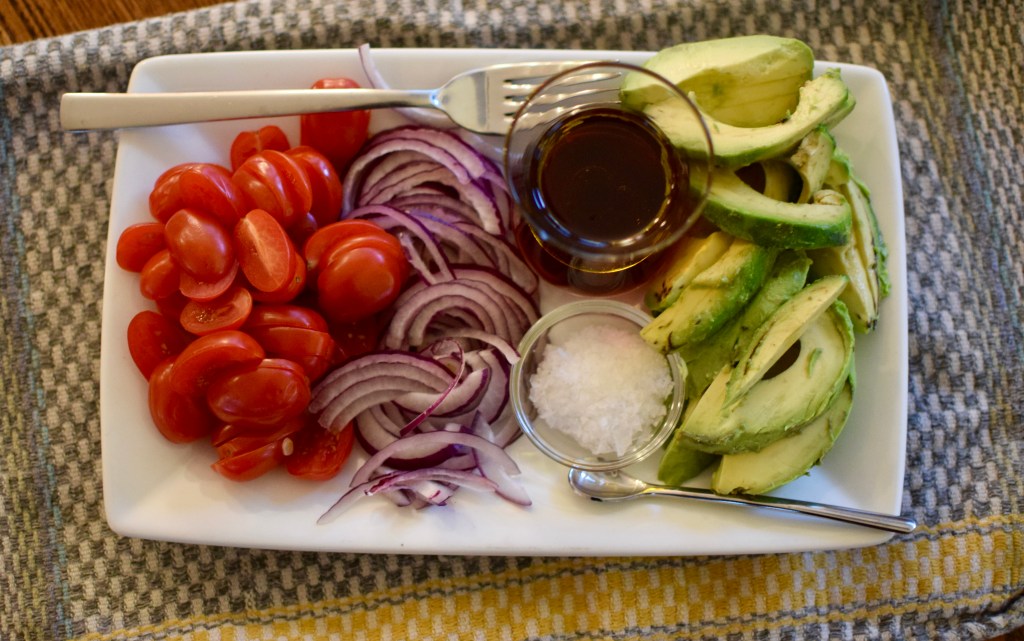 Place the avocado slices on a platter, season with a big pinch of salt, top with sliced tomatoes and red onion. Season those with salt. Drizzle with the vinegar and oil. [When I served it, I made it more of a side by side platter and had people build their own salad on top or beside their bowl of rice and beans.]