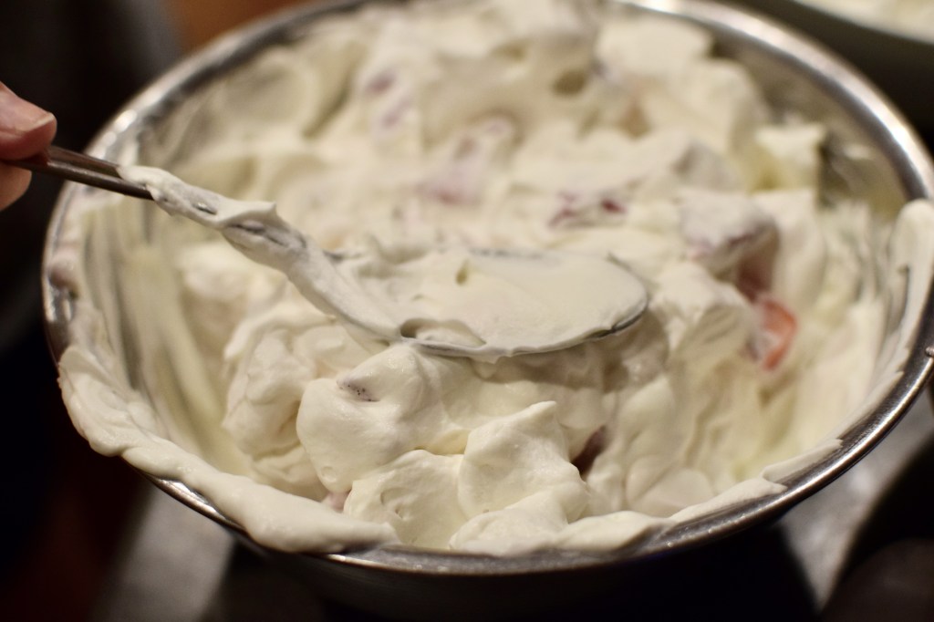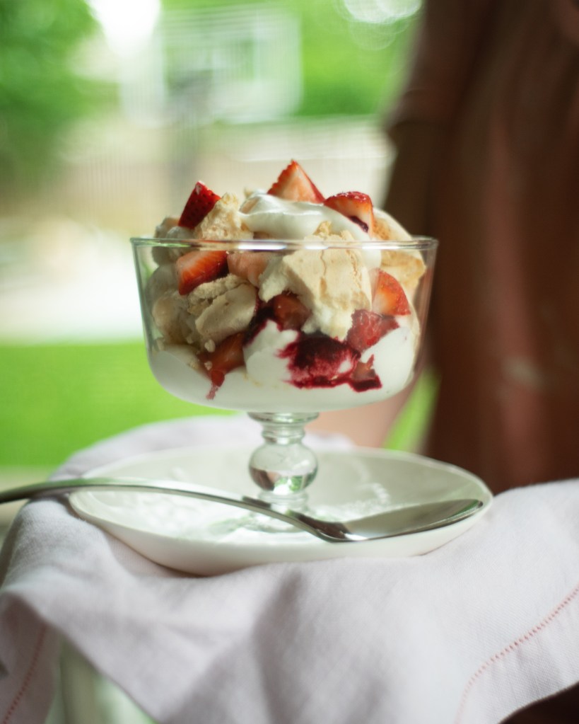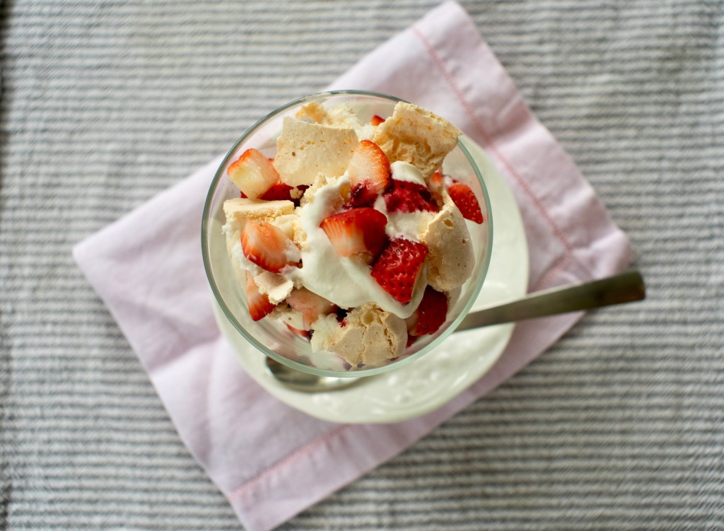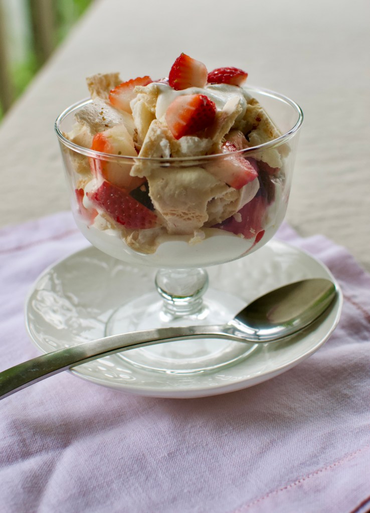Basically the story is that Eton, a prestigious school in England, served posh food to their students and one day the cook was preparing to serve a Pavlova (a lovely meringue pillow topped with whipped cream and fruit). As she was transporting it, it fell and crumbled into a mess. The cooks recovered it by scooping it up and serving it, and thus “Eton Mess”!